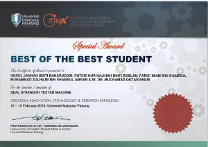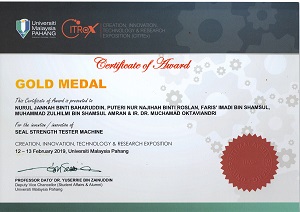 Gold Medal Award, Seal Strength Tester Machine, Creation, Innovation, Technology & Research Exposition (CITREx-2019)