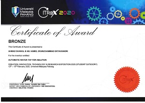 Bronze Medal Award, Automatic Water Tap for Ablution, Creation, Innovation, Technology & Research Exposition (CITREx-2020)