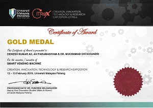Gold Medal Award, Smart Vending Machine, Creation, Innovation, Technology & Research Exposition (CITREx-2019)