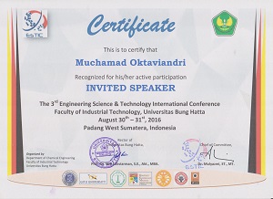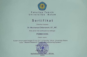 Speaker, "Public Lecture: Current Research Trend in Manufacturing System", Fakultas Teknik, Universitas Batam, Indonesia, 2017.
