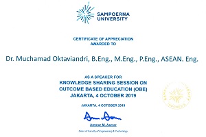 Speaker, "Knowledge Sharing Session: Outcome Based Education (OBE) Constructive Alignment", Faculty of Engineering & Technology, Sampoerna University, Jakarta, Indonesia, 2019