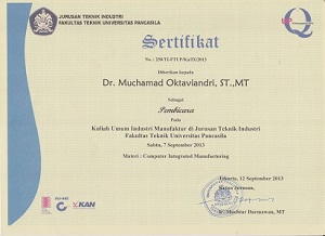 Speaker, "Public Lecture: Computer Integrated Manufacturing", Fakultas Teknik, Universitas Pancasila, Jakarta Indonesia, 2013.