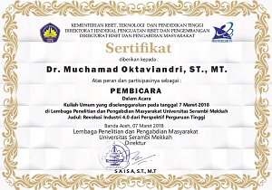 Speaker, "Public Lecture: Revolusi Industri 4.0 dari Perspektif Perguruan Tinggi", Universitas Serambi Mekkah, Aceh, Indonesia, 2018.