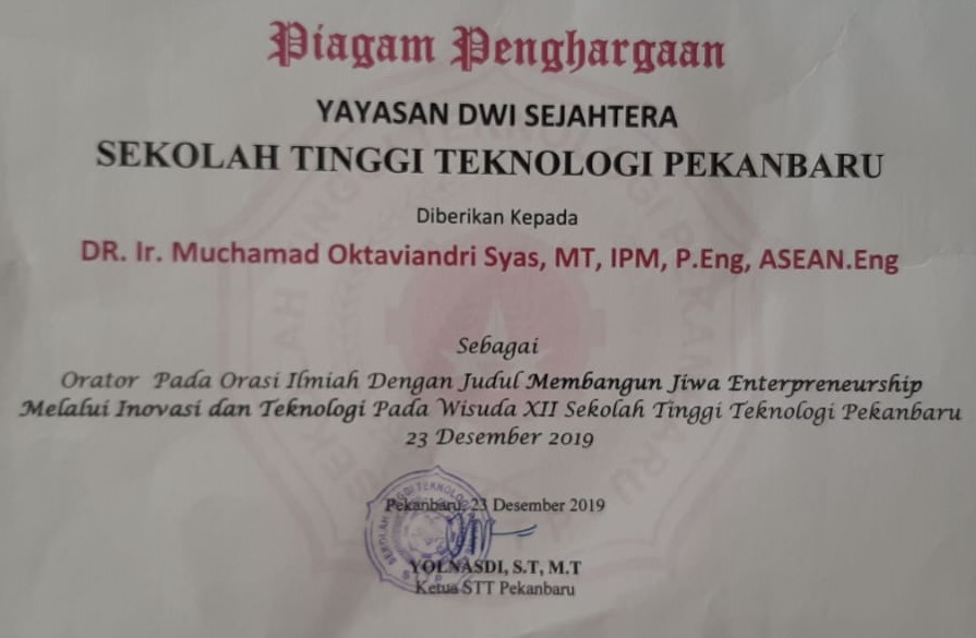 Orator, "Orasi Ilmiah Wisuda Sarjana ke-12: Membangun Jiwa Entrepreneurship melalui Inovasi dan Teknologi", Sekolah Tinggi Teknologi Pekanbaru, Pekanbaru, Indonesia, 2019.