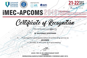 Reviewer, Innovative Manufacturing, Mechatronic & Material Forum 2020 (iM3F-2020) 2020.