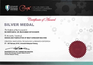 Silver Medal Award, Meat Shredder Machine, Creation, Innovation, Technology & Research Exposition (CITREx-2018)