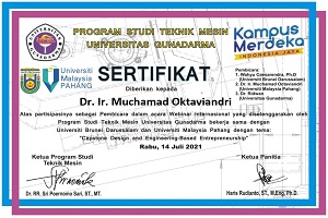 Speaker, “Webinar International: Capstone Desin and Enginerring Based Entrepreneurship” Universitas Gunadarma, Jakarta, Indonesia, 2021.