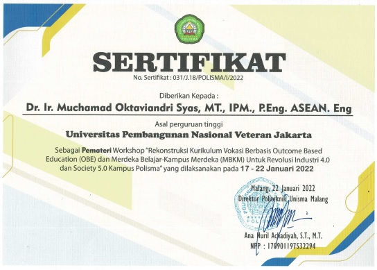 Speaker, “Workshop: Rekonstruksi Kurikulum Vokasi Berbasis Outcome Based Education dan Merdeka Belajar Kampus Merdeka untuk Revolusi Industri 4.0 dan Society 5.0 Kampus POLISMA”, Politeknik Unisma Malang (POLISMA), Malang, Indonesia, 2021.