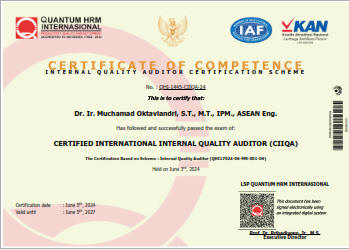 Certified International Internal Quality Auditor, by The Quantum HRM International, Certificate No. QHI-1445-CIIQA-24 (3rd June 2024). |