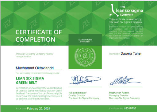 Certified Green Belt Lean Six Sigma, by The Lean Six Sigma Company, Certificate No. 74598151 (29th Feb. 2024). |